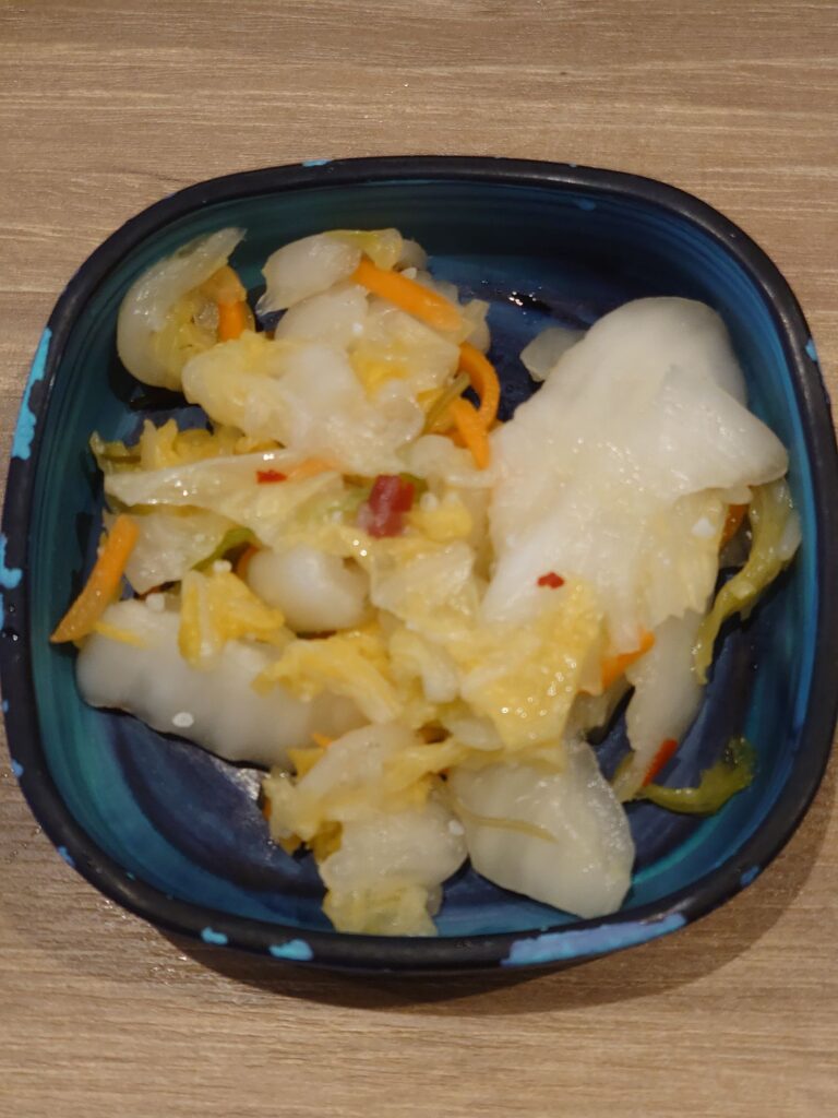 白身の入っている鉢にお新香、紅ショウガ(お好み)と七味をダイブさせます。