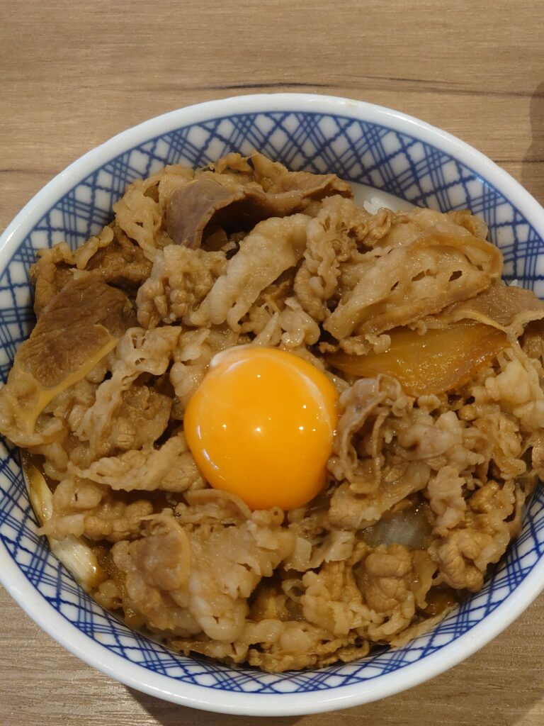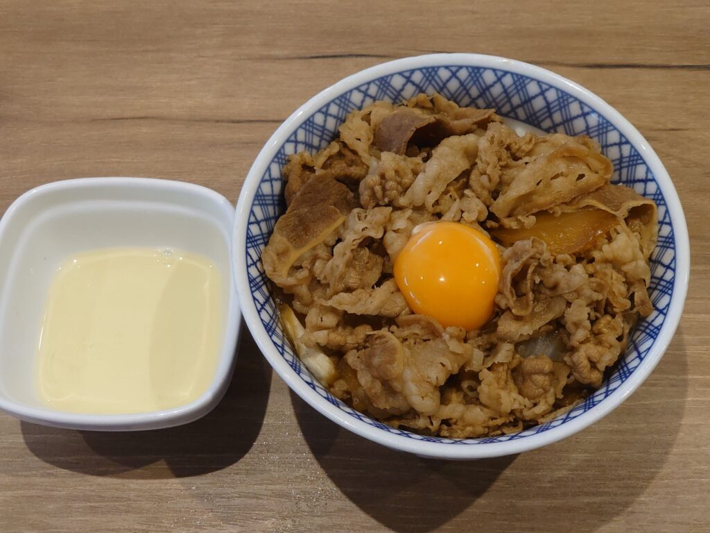 牛丼の真ん中に黄身を載せるとバエます(謎)